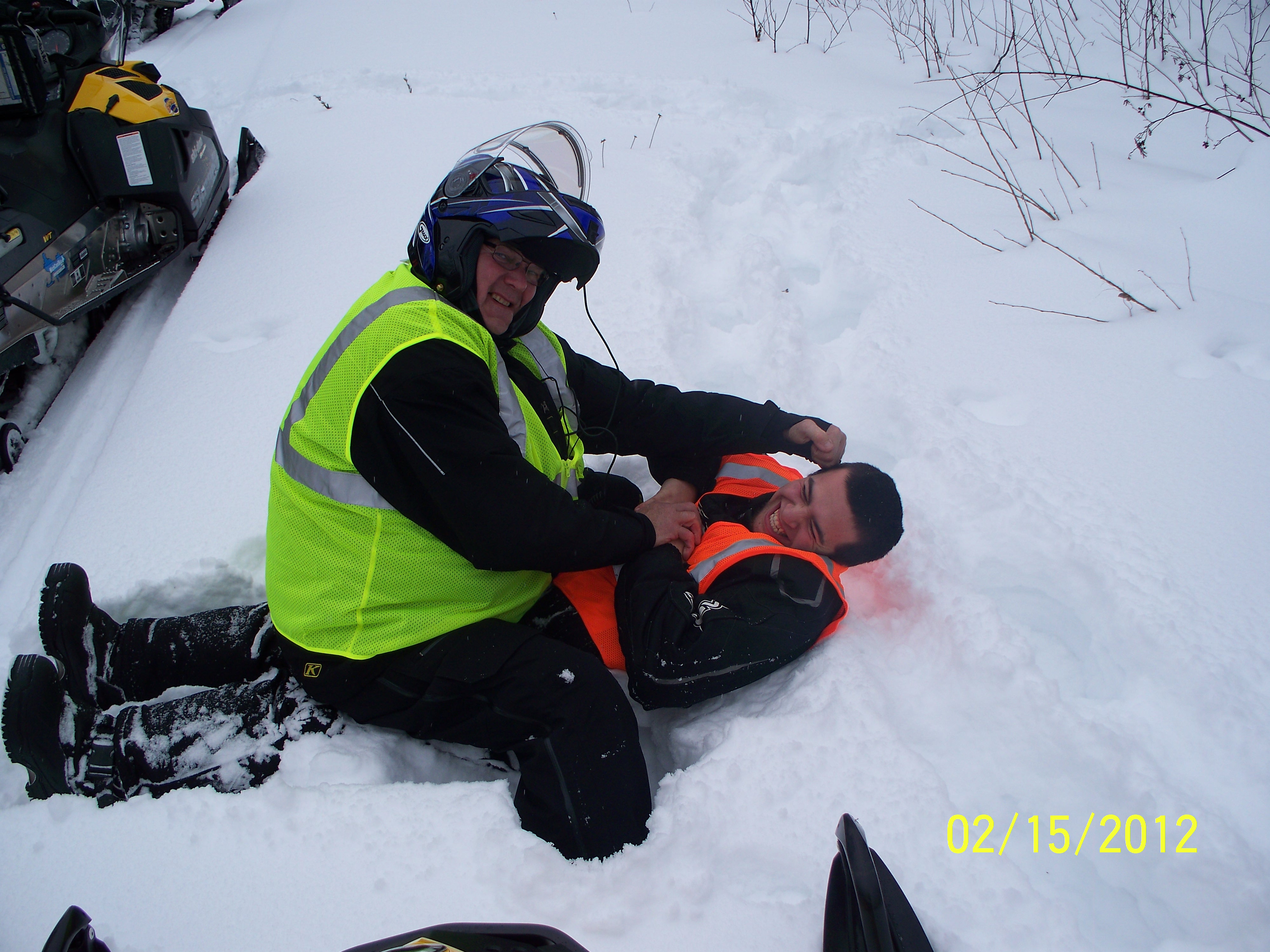 We always have time to have some fun. Tyler is seeing how deep the snow is and Don helping him.