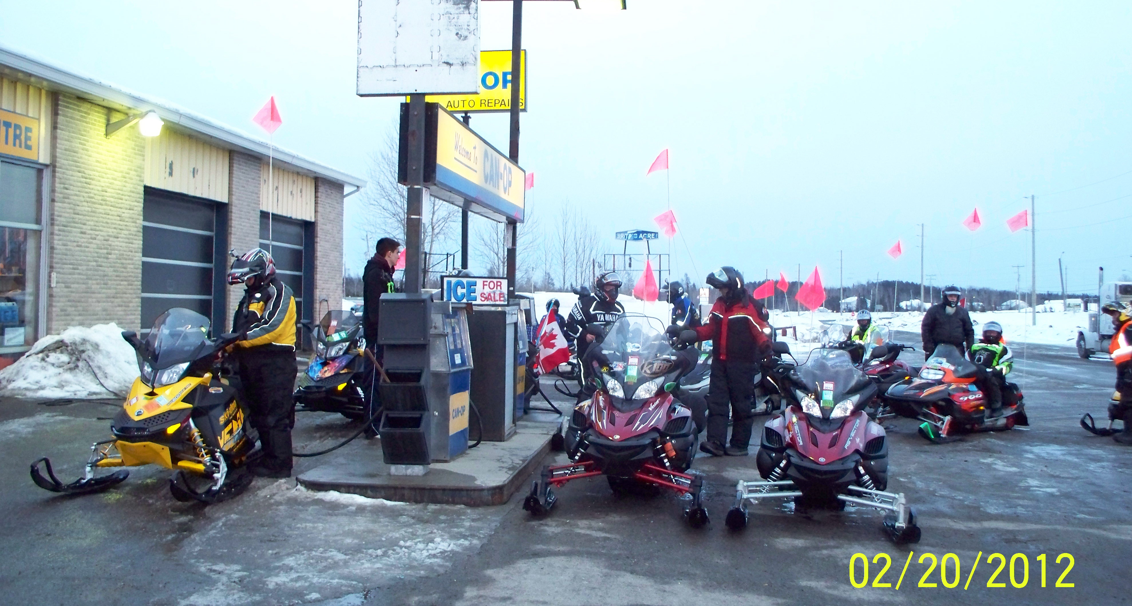 17 riders left Hearst this morning heading for Longlac. It was a good ride with just a few mishaps. Larry Wormnest had a little encounter with the deep snow off the trail but was rescued by Randy Belliel and Dave Upthegrove but in the mist of sawing a few trees out of the way – they forgot the saw on the trail and Randy B and Dave U went back to recover the saw but Dave U found a few more trees off the trail and had to be helped out of the pucky brush…..On our way again and Ron Krupp thought we needed a little more excitement and he checked out how deep the snow was off the trail…..Stuck again….. but thanks to all of our safety people we had a bungee on board and he was pulled to safety..We had a long day today 250 miles and one of the things we have to do is gas our sleds. With so many sleds it takes between 20 to 30 minutes to gas everyone up. Especially when you are at a remote stop that has only one gas spigot.