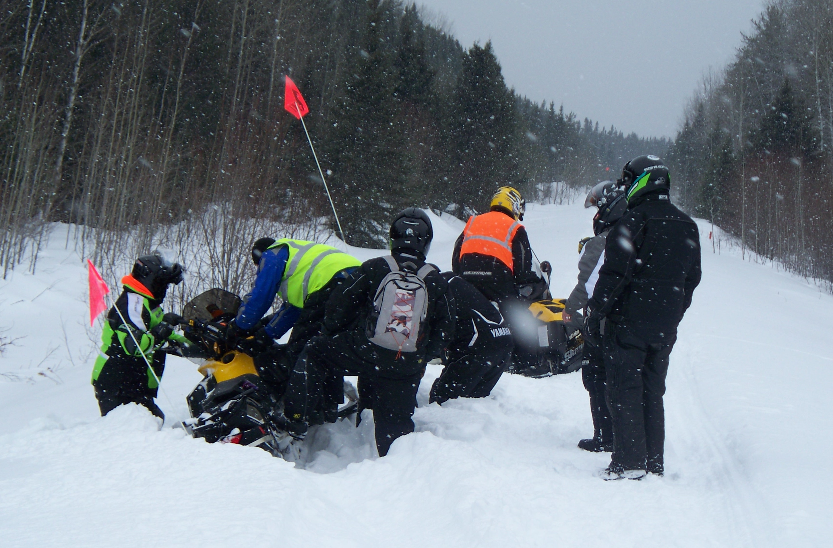 During lunch in Geralton, Ontario we coordinated with local guides to help us ride down to Beardmore, Ontario. The plan was to ride the railroad grade (old train tracks – removed) most of the way to Beardmore and then hop on the gas pipeline the rest of the way there (about 60 miles). The ride started fine with the trail narrowing down to one snowmobile track after 25 miles. The deep snow inexperienced riders starting getting stuck. Riding just a few inches off the single track would pull a sled into waist deep snow and precariously close to falling off the railroad grade and was an ominous job get back on the trail.