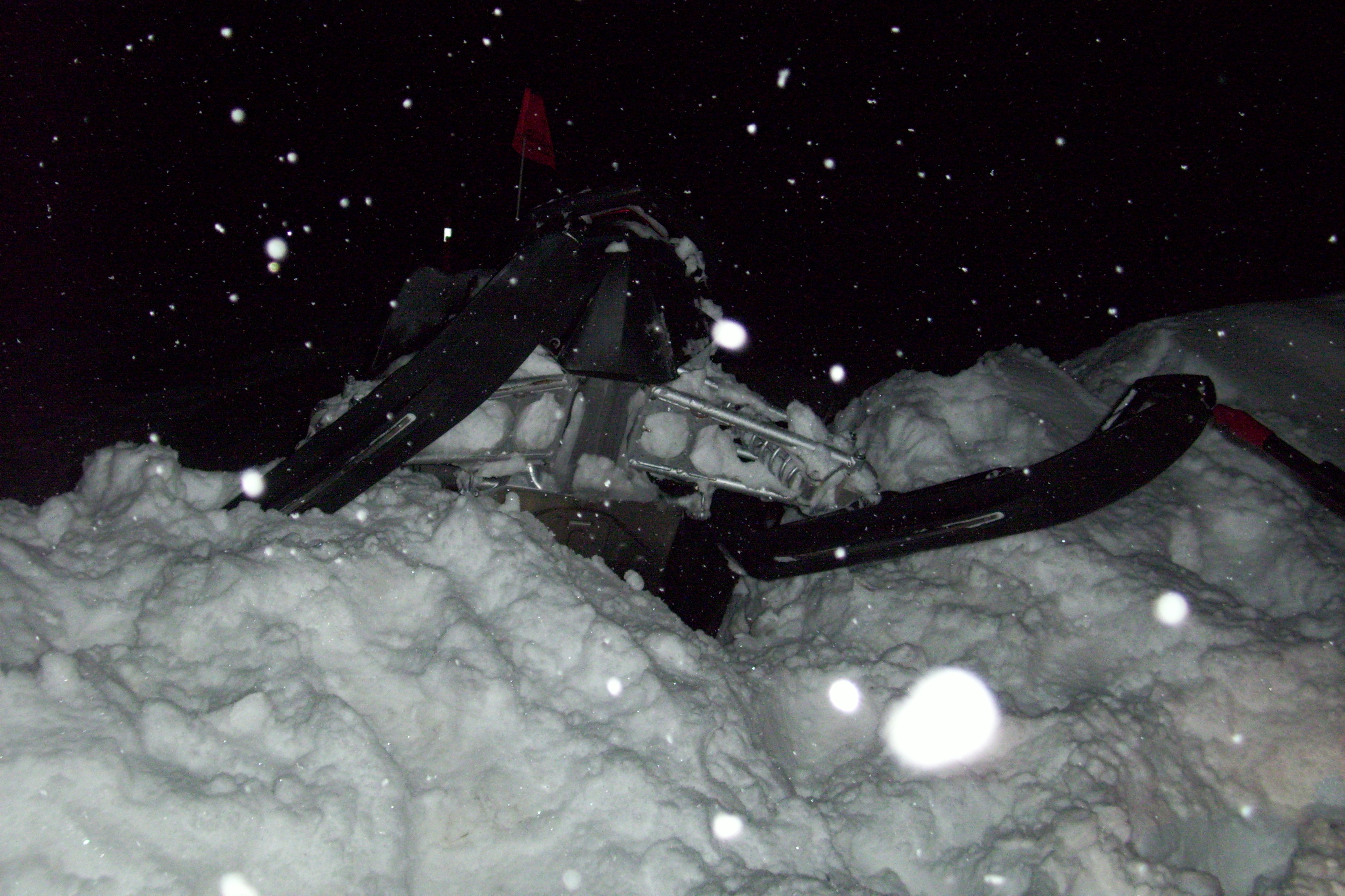 At this point the previous tracks we were riding stopped and turned around, leaving only one of our guides in front of me breaking a fresh trail. I quickly realized this was going to be impossible to get the group through and stopped and radioed the other three sleds in the group behind me who were radio equipped, telling them to turn around. I called the support vehicles drivers with the Sat Phone to have them come to a point where we could have most of the sleds and drivers picked up. I then went after the local guide breaking trail to make sure he turned around and to ensure he did not get stuck out there by himself.