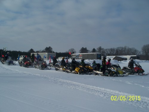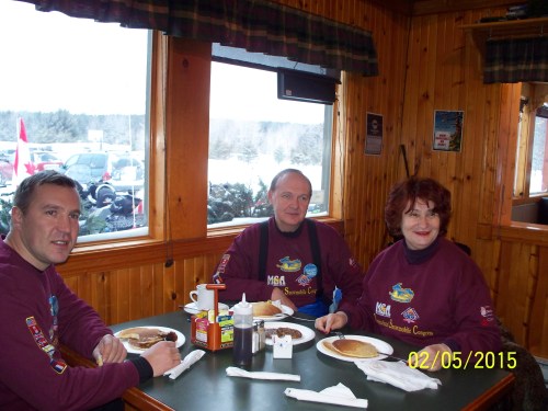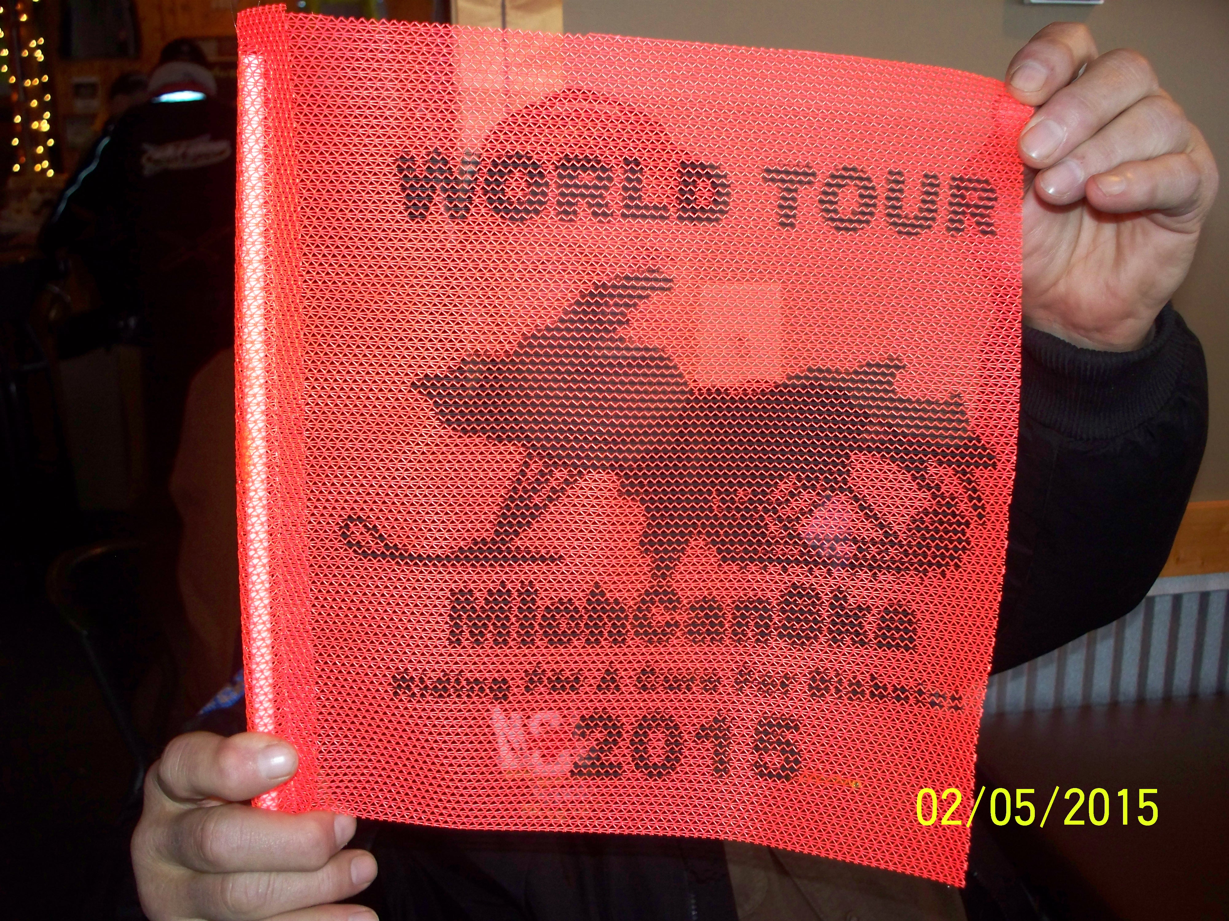 MichCanSka rides again…..This is the new flag that will be on the back of all riders sleds. We started our journey this morning at the Coyote Crossing with the temp at -9. We had a wonderful pancake breakfast and a blessing of the snowmobiles and the riders. Keep us all in your prayers as we start our new adventure.